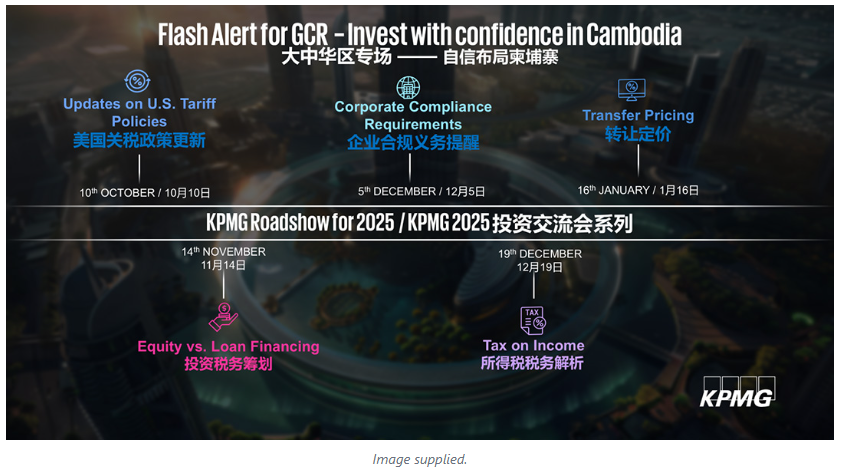 KPMG in Cambodia announced the launch of the GCR Roadshow 2025 on October 10, a focused series of expert-led workshops designed to equip investors from the Great China Region (GCR) with the insights, tools, and confidence to navigate Cambodia’s dynamic and evolving business environment.