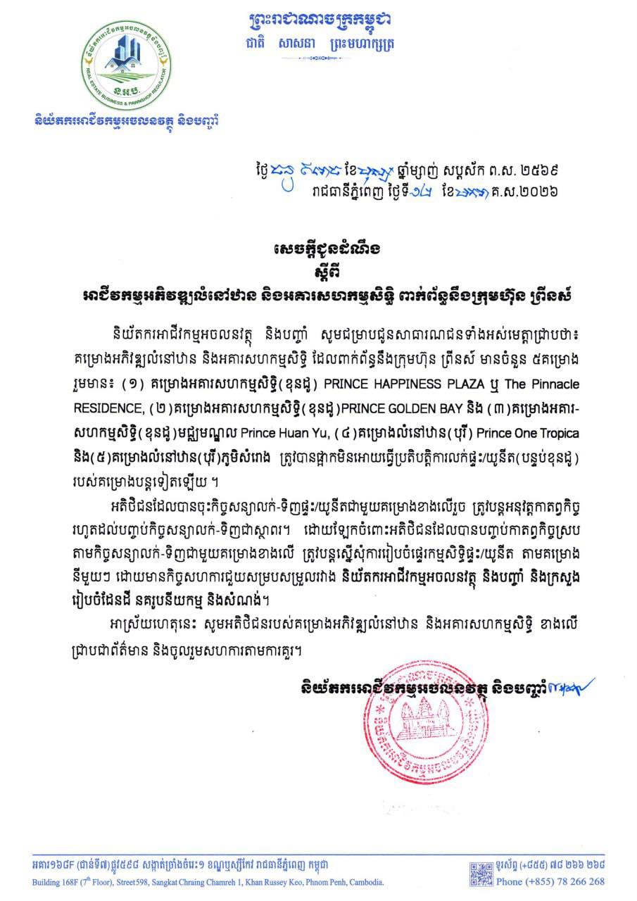 The sales suspension of Prince Group residential projects follows the liquidation of Prince Bank by the National Bank of Cambodia (NBC). Morisonkak MKA, the local audit company assigned by the NBC as the official liquidator of Prince Bank, informed depositors and creditors on January 12 that they have 30 days from the date of notice to submit information and claim their funds, after which they can no longer demand compensation.