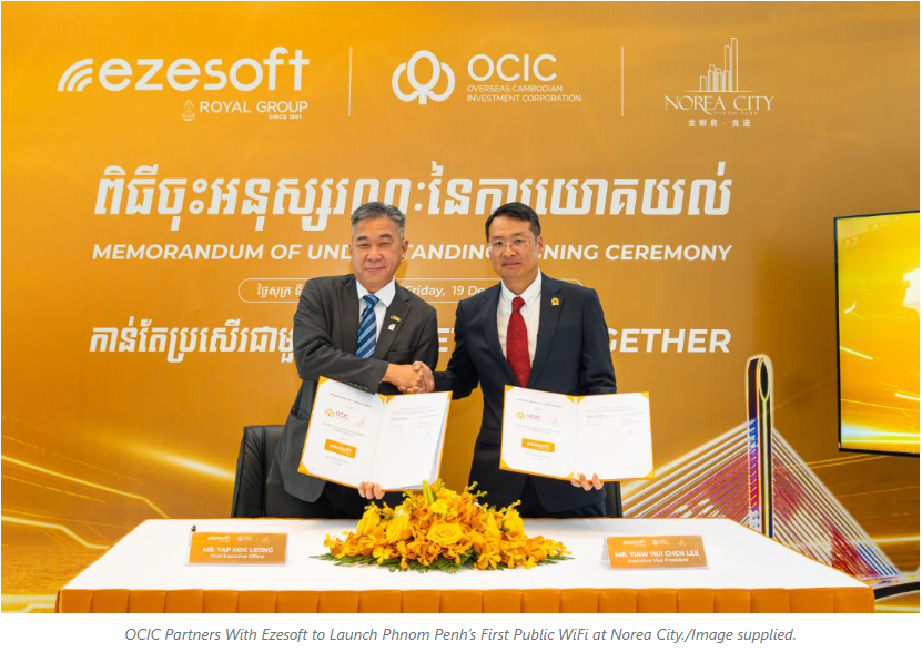 Overseas Cambodian Investment Corporation (OCIC), a diversified local investment and development conglomerate, and Ezesoft, Cambodia’s leading digital solutions and services provider, announced a strategic partnership to launch WiFiX, Cambodia’s first large-scale public WiFi zone. WiFiX will debut at Norea City, providing free, secure, 24/7 internet access for all. The agreement was signed by Luis Chen, Executive Vice President of OCIC, and Yap Kok Leong, Chief Executive Officer of Ezesoft.