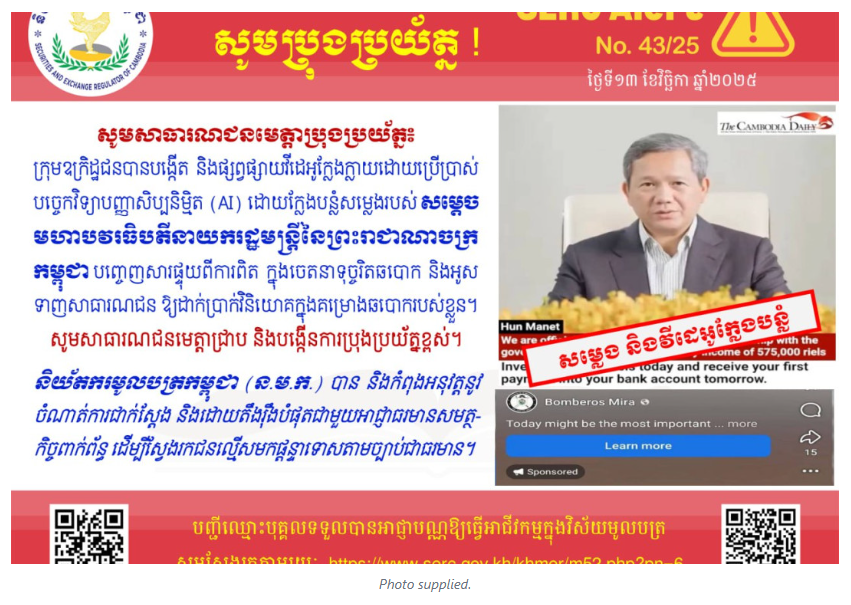 The Securities and Exchange Regulator of Cambodia (SERC) on 13 November 2025 issued a public warning urging citizens and investors to exercise heightened vigilance amid a rise in fraudulent online investment advertisements that use Artificial Intelligence (AI) to deceive the public.